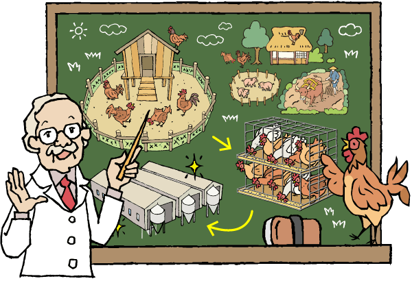 まず、品種改良には世界各地のよい鶏種を入手できなければなりません。そのころ各国の大型汽船による遠洋航海が始まりましたが、冷蔵保存技術がなかった当時は、船員の食糧として生きた鶏が最適でした。その理由は①他の畜種に比べて飼育の場所を取らず、飼育管理が容易。②餌の効率がよく飼料保管庫の場所を取らない。③新鮮な鶏卵を得ることができる。④産卵低下の老鶏は食肉として利用できる。